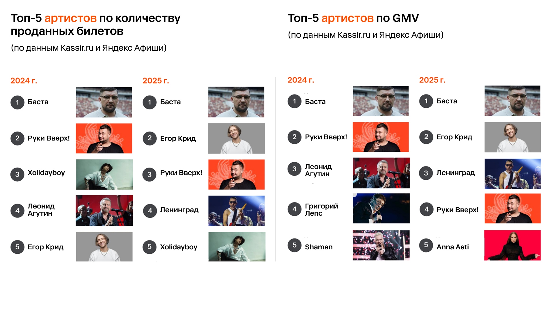 По данным билетных операторов, в топ-5 по количеству билетов и объемам продаж стабильно входят Баста, Руки Вверх! и Егор Крид: