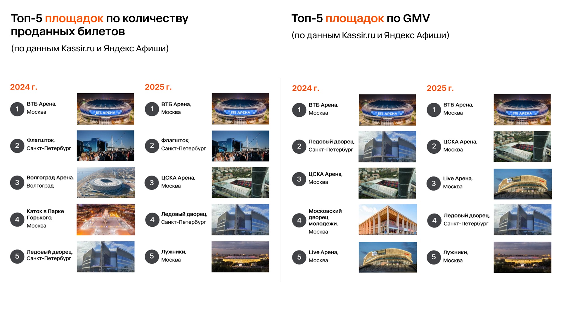 Среди концертных площадок по объему проданных билетов традиционно лидируют площадки из Москвы и Санкт-Петербурга: ВТБ Арена, ЦСКА Арена и Live Арена.