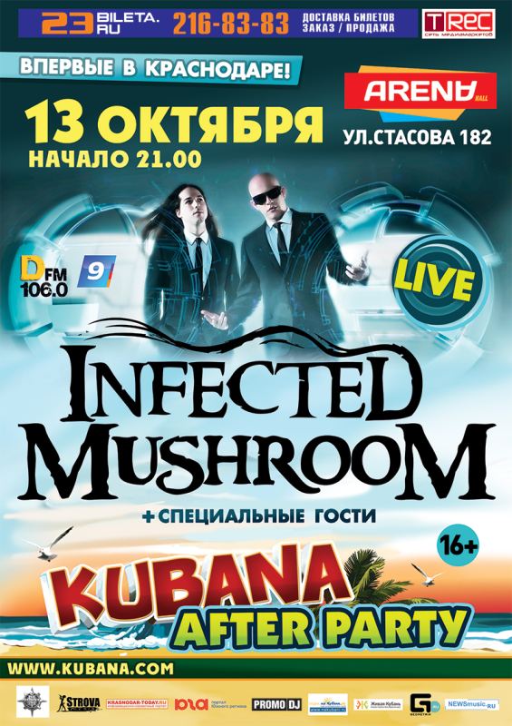Вечеринка состоится 13-го октября в Краснодаре, на одной из лучших концертных площадок города - Arena Hall. Хедлайнерами мероприятия станут признанные флагманы мирового транс-хардкора и большие друзья Кубаны - Infected Mushroom! Команда уже демонстрировала своё музыкальное мастерство на KUBANA-2011 и KUBANA-2012, поэтому превосходно знакома аудитории Полуострова Свободы. Энергетика этого коллектива не поддается описанию и уже давно сделала из Infected Mushroom мировых звезд первой величины. Эти безумные экспериментаторы электронного и живого звучания обещают порадовать нас эксклюзивным сэтом, сочетающим в себе лютые трансовые ритмы и жгучие гитарные соло.