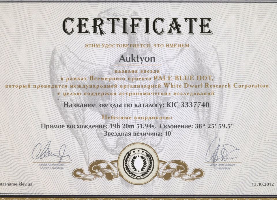 Также в сертификате указано, что "проект "Звезда в подарок" осуществляется в рамках международной программы Pale Blu Dot, реализуемой по инициативе астрономов всего мира, организации White Dwarf Research Corporation и Kepler Asteroseismic Science Consortium".