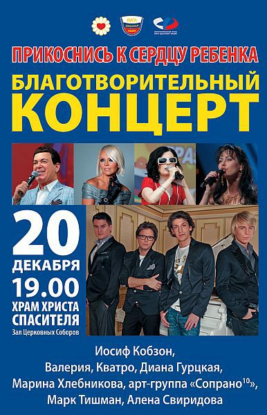 По окончании церемонии состоится благотворительный концерт с участием звезд эстрады - Иосифа Кобзона, Валерии, группы Kvatro, Дианы Гурцкая, Марины Хлебниковой, арт-группы «Сопрано-10» и Марка Тишмана.
