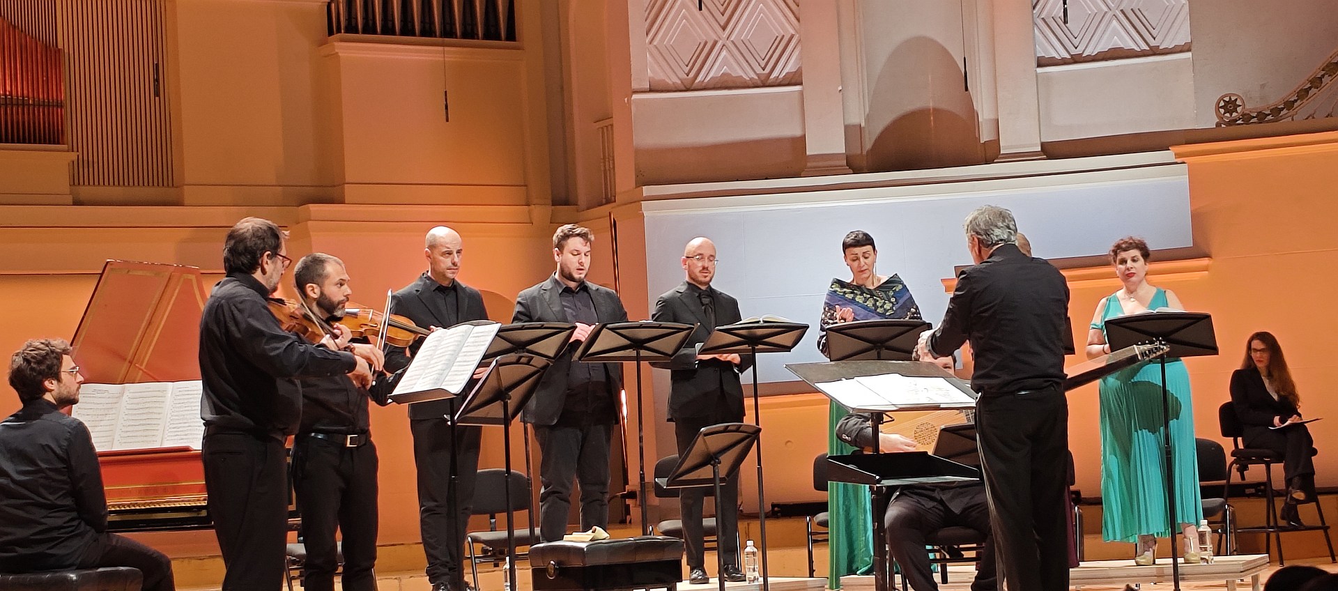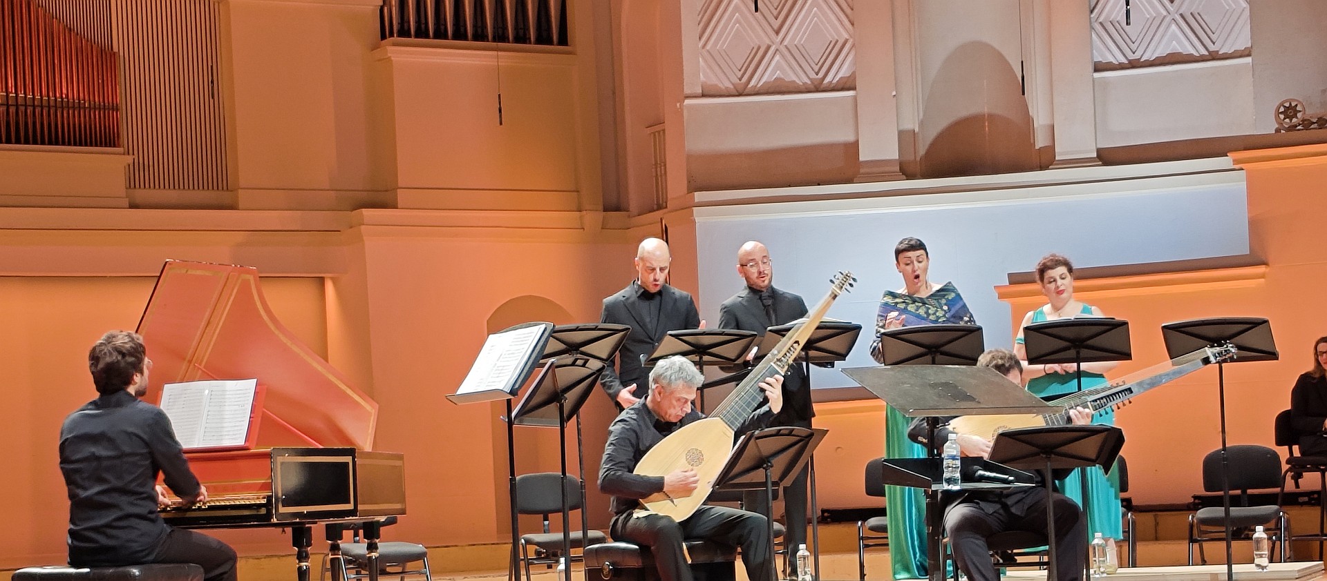Прозвучали незаявленные в программе мадригал Монтеверди «Жалобы нимфы», а потом мадригал Строцци «Влюбленный Гераклит». У Монтеверди интересны были непривычные полутоновые интервалы в вокальной полифонии, нечасто такое услышишь в академической музыке XVII века. Ну и без театра точно не обошлось: меццо-сопрано спустилась балкона КЗЧ, пела чрезвычайно тревожно. Публика даже зааплодировала после ее партии, но та стоически дождалась конца аплодисментов с нужным выражением лица, и лишь после коды сумела улыбнуться. Да и Строцци тоже разыграли: тенор спустился с другого балкона, и буквально рассказала историю несчастливой любви под очень грустный клавесин и надрывы скрипки в дуэте с тенором. Аутентичнее некуда.