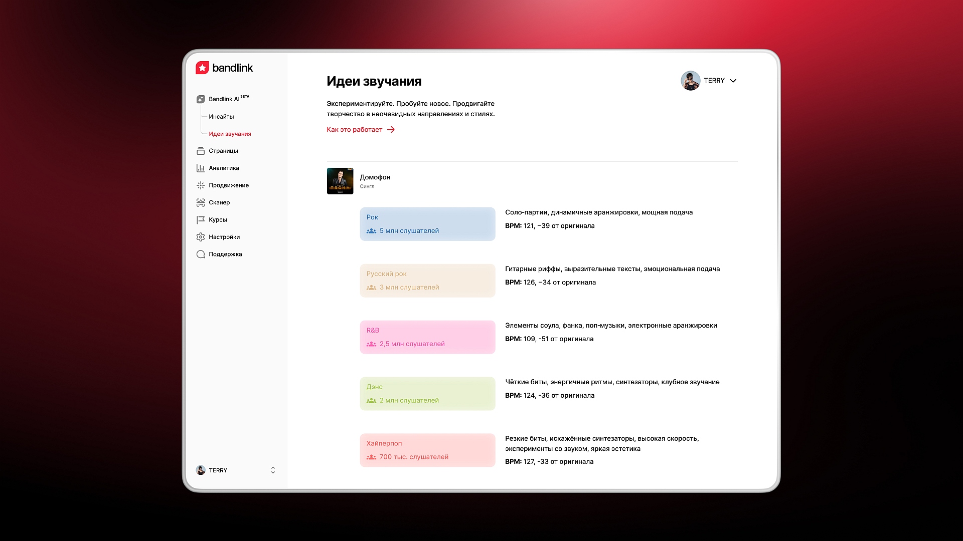«Идеи звучания» от BandLink AI работают на основе алгоритмов Яндекс Музыки. Они анализируют, что еще нравится активным слушателям трека артиста, и предлагают музыкальные направления с наибольшим потенциалом роста аудитории — за счет их реального интереса, а не трендов. ИИ-помощник дает рекомендации по жанрам, настроению трека и его темпу (ВРМ), которые можно забрать с собой в студию.