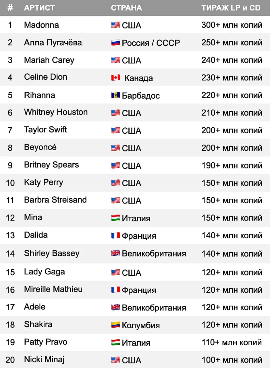 Согласно данным, собранным TopHit, в тройку самых «тиражных» исполнительниц вошли Мадонна, Алла Пугачева и Мэрайя Кэри. Более чем 300 млн изданных записей Мадонны зафиксированы даже в Книге рекордов Гиннеса. Алла Пугачёва занимает вторую строчку этого рейтинга с суммарными тиражами винила и CD в 250+ млн экземпляров. Носители с записями певицы производились и продавалась в СССР и в постсоветской России, часть тиражей сертифицировалась и издавалась в европейских странах социалистического лагеря, а также в Швеции, Финляндии, Германии, Израиле, Южной Корее и Японии. Кроме того, Пугачёва — лидер по тиражам на европейском континенте, своих ближайших «конкуренток» — итальянку Мину, француженку Далиду, англичанку Ширли Бэсси она опережает более чем на 100 млн копий.