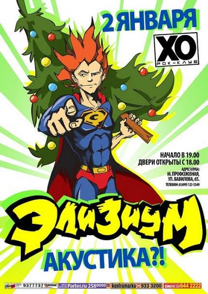 2 января состоится традиционый новогодний концерт «Элизиума» в столичном клубе XO. Уже который год группа дает постновогодний концерт на котором исполняет программу “Акустика?!”.