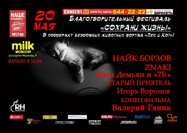 Чтобы их было как можно меньше, мы приглашаем вас принять участие в фестивале «Сохрани жизнь четвероногим друзьям!». Помочь беднягам и выступить с эксклюзивными сетами согласились многие известные артисты, которым также не безразлична судьба беспризорных животных.